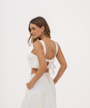 Blusa corta, forrada, tiras anchas, copas con centro fruncido, tira ancha para anudar en espalda, bolero inferior.