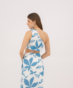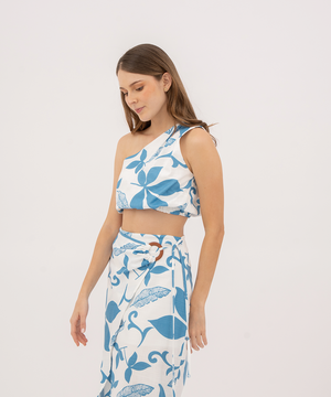 Blusa escote asimétrico, prenses en hombro izquierdo, cintura resortada, silueta englobada