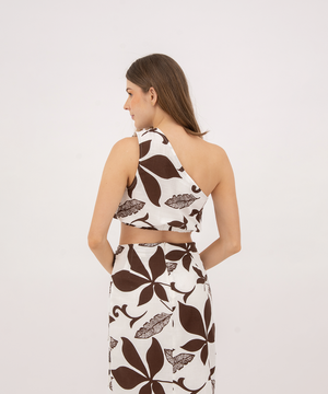Blusa escote asimétrico, prenses en hombro izquierdo, cintura resortada, silueta englobada