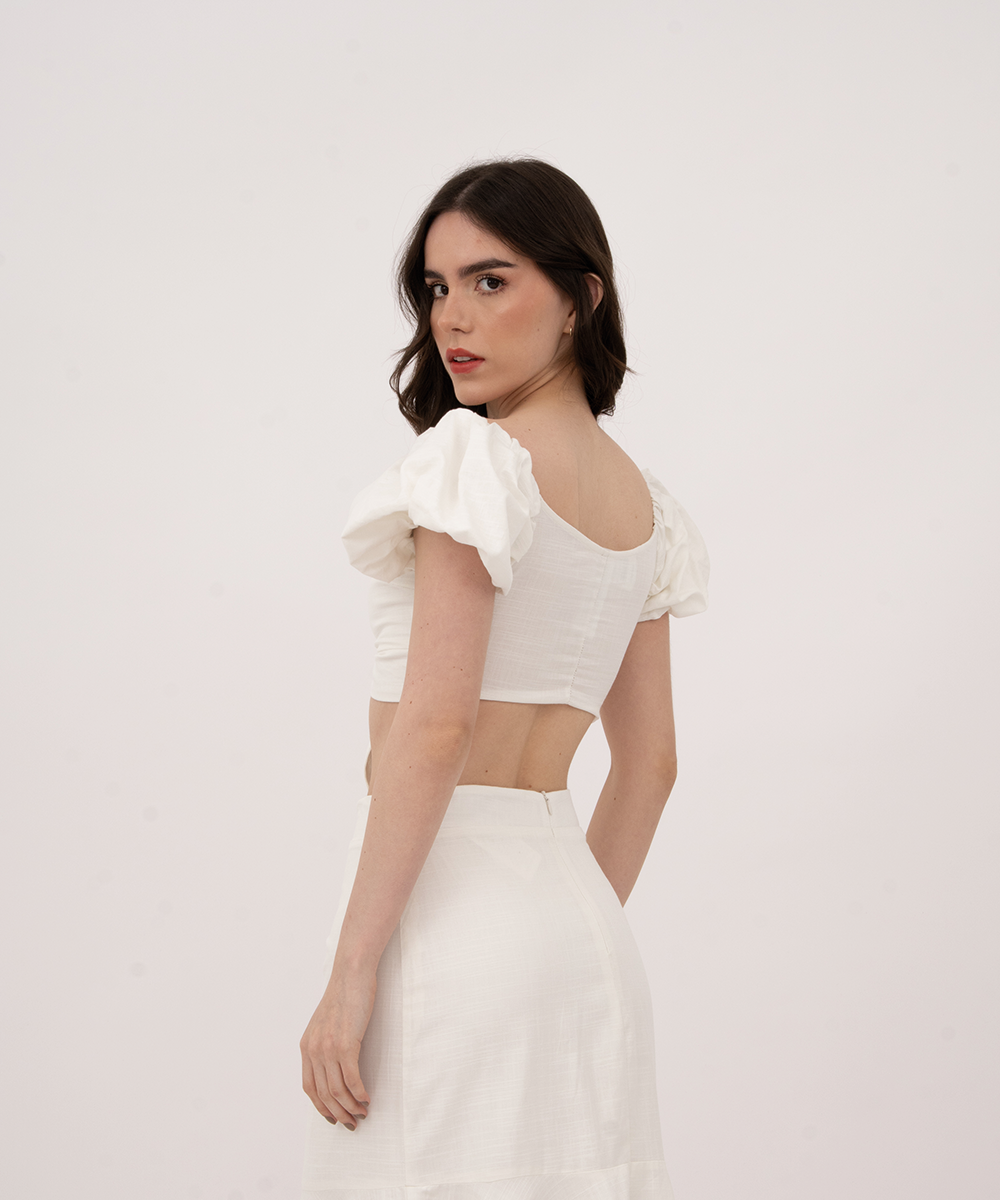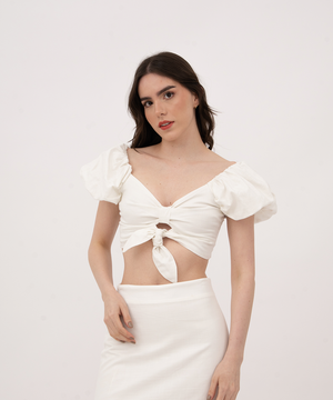 Crop top, manga con volumen resortadas y lazo para anudar en frente.