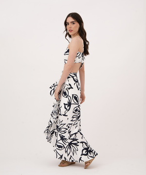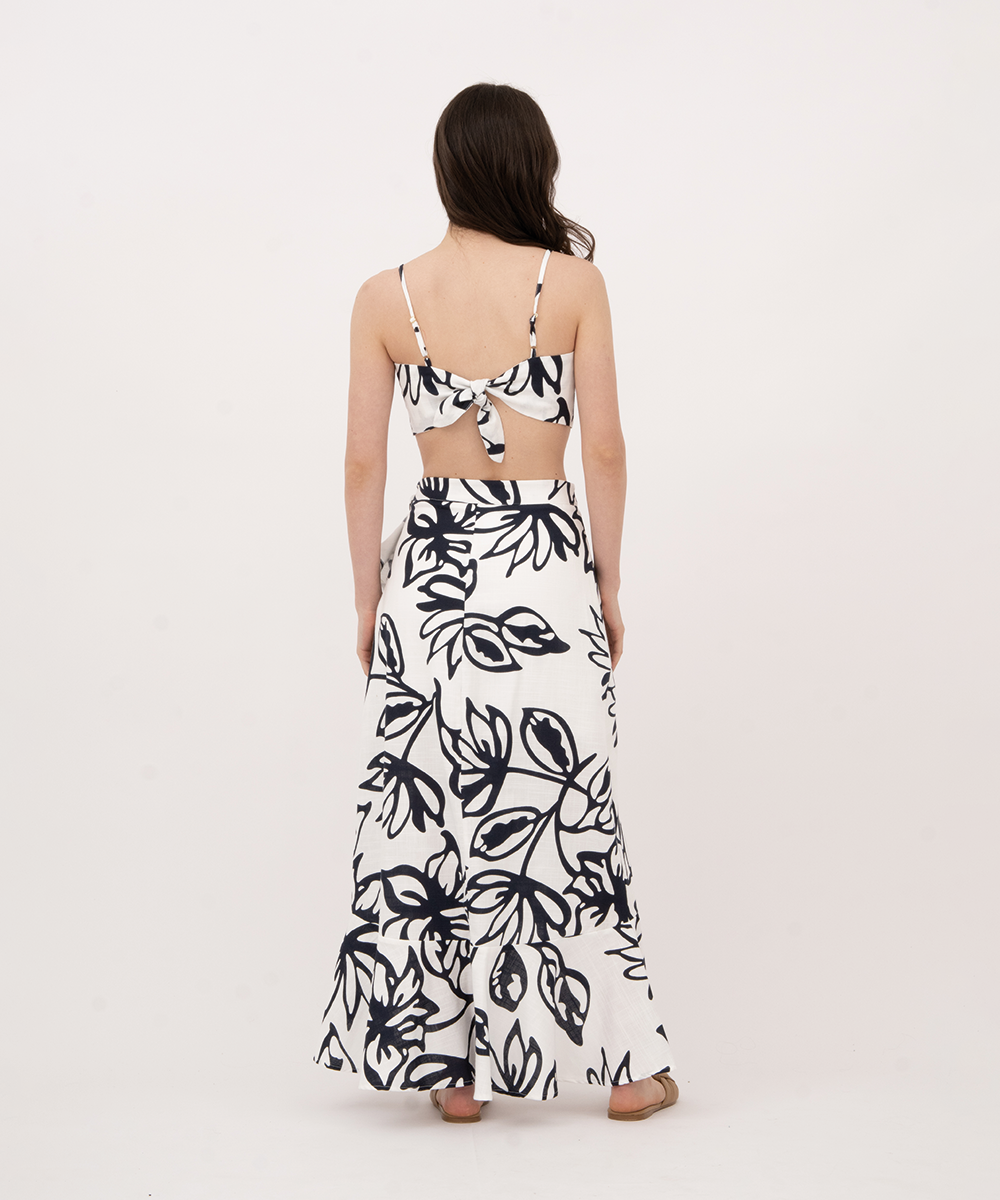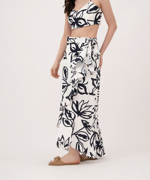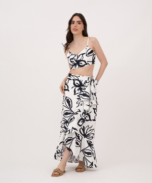 Falda cruzada con lazo para anudar a un costado, botón interno en pretina y boleros.