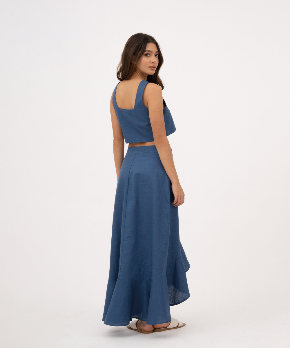 Falda cruzada con lazo para anudar a un costado, botón interno en pretina y boleros.