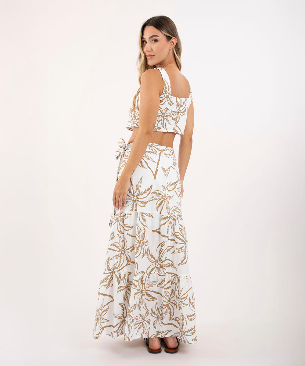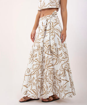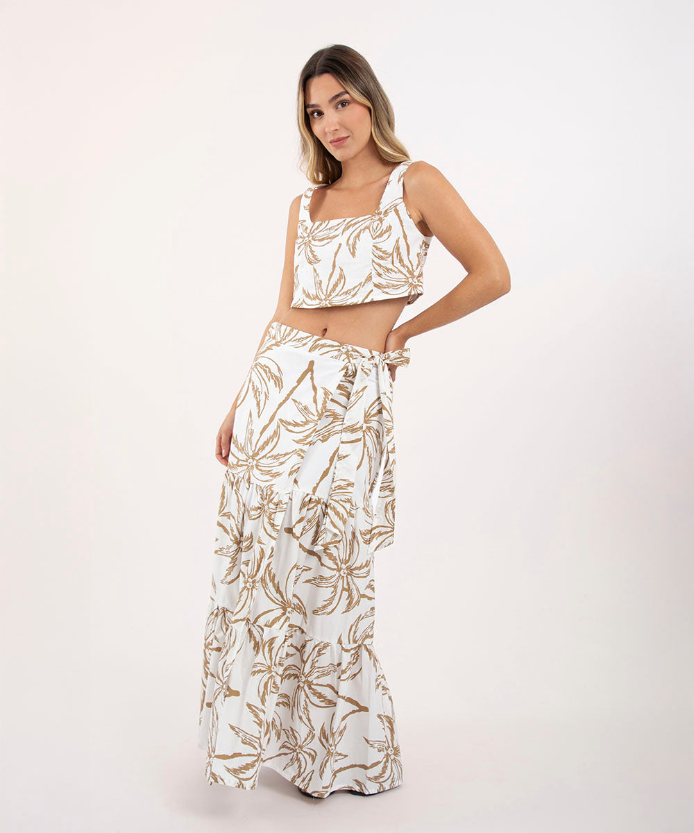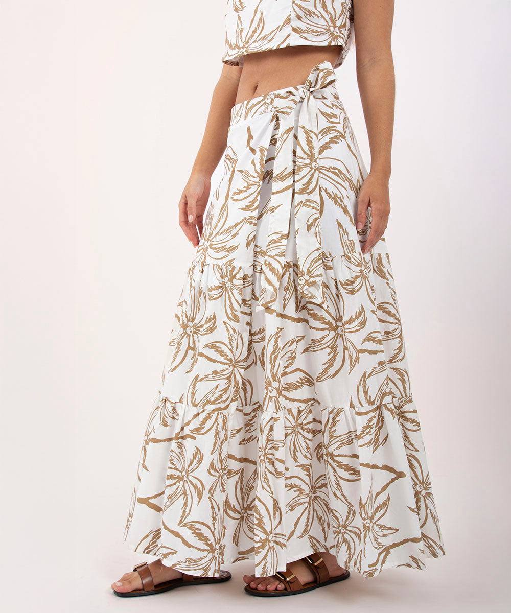 Falda larga con tiempos, botón interno, tira para anudar en costado, forro interno cuerpo 100% algodón forr 96% poliester 4% spandex