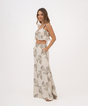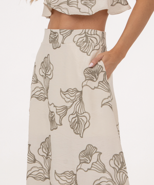 Falda larga con forro, bolsillos laterales, pretina y cierre invisible en centro posterior.