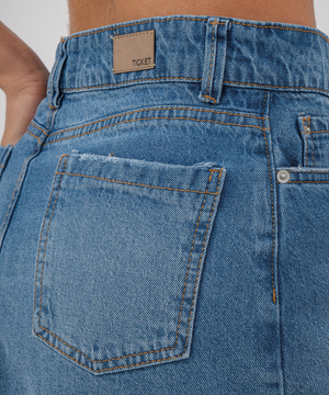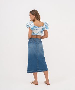 Falda midi 5 bolsillos con abertura en delantero, silueta semi ajustada.