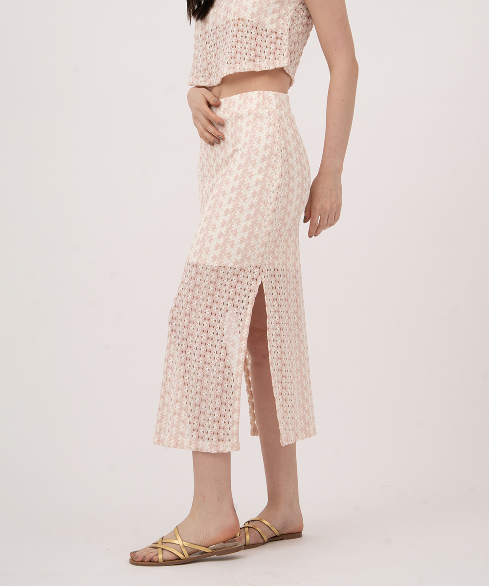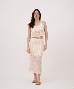 Falda midi forrada con aberturas en costados y pretina resortada. Cuerpo 100% poliéster forro 93% poliéster 7% elastano