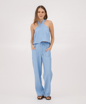 Pantalón tiro medio, cintura elástica ajustable con cordón, bolsillos en el frente y posterior