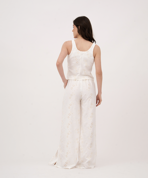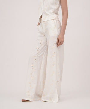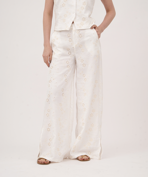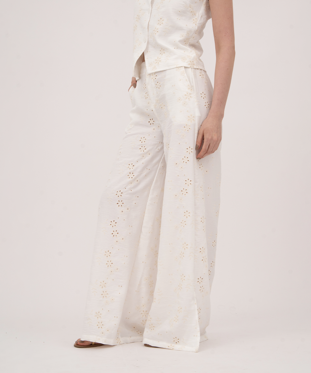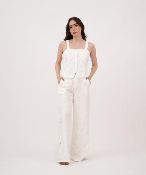 Pantalón pretina delantera lisa con cierre y botón, posterior con elástico, bolsillos diagonales y aberturas en botas.