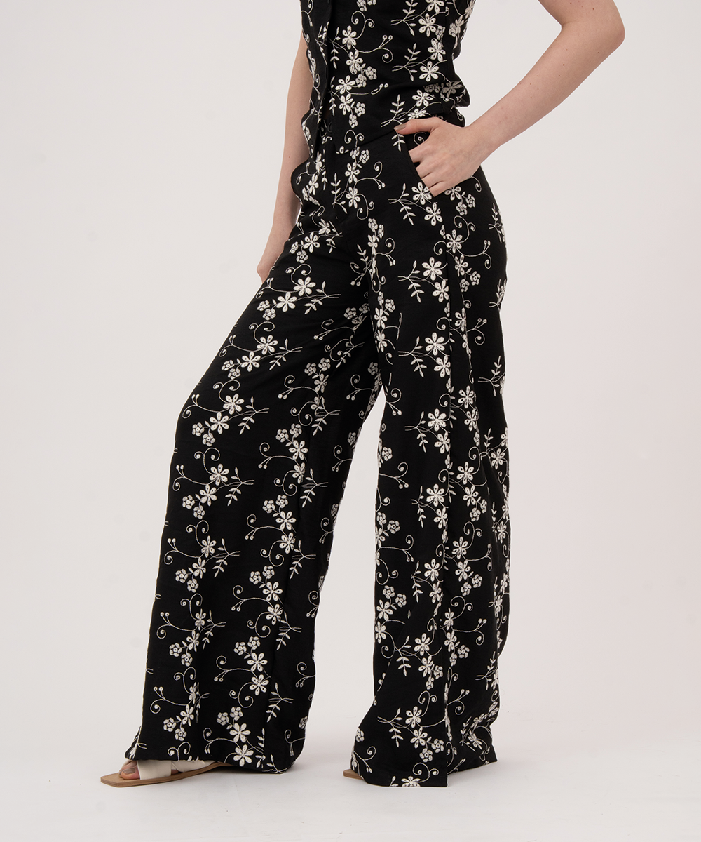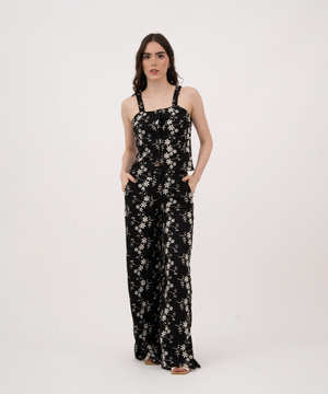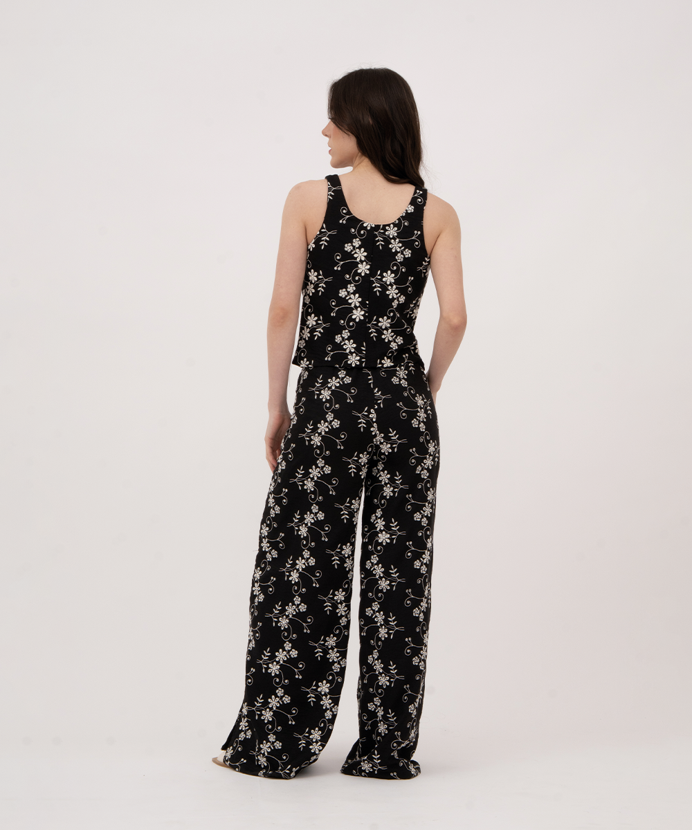 Pantalón pretina delantera lisa con cierre y botón, posterior con elástico, bolsillos diagonales y aberturas en botas.