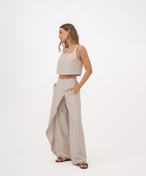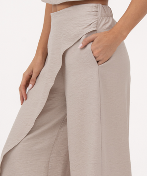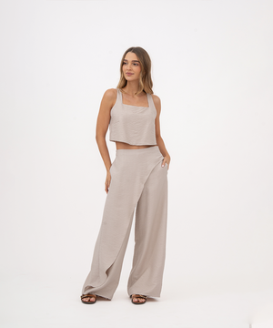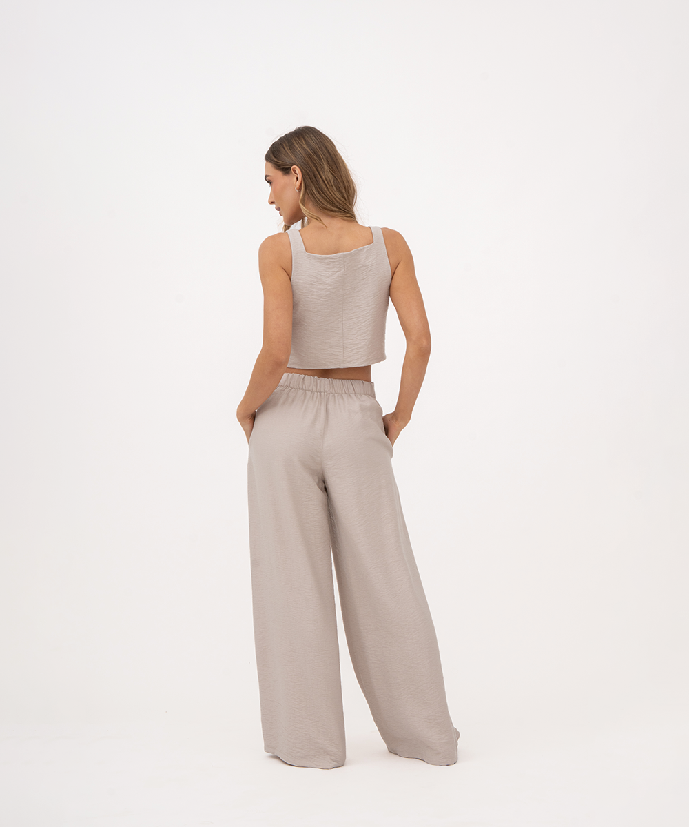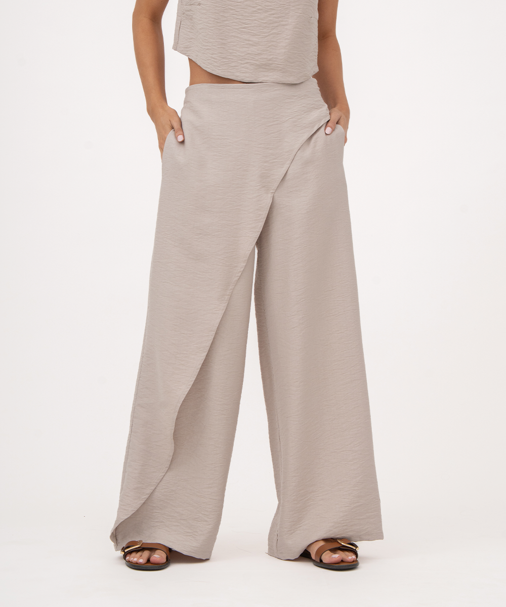 Pantalón tiro medio, corte palazo de pierna ancha, diseño asimétrico con cruce delantero y cintura posterior elástica.