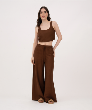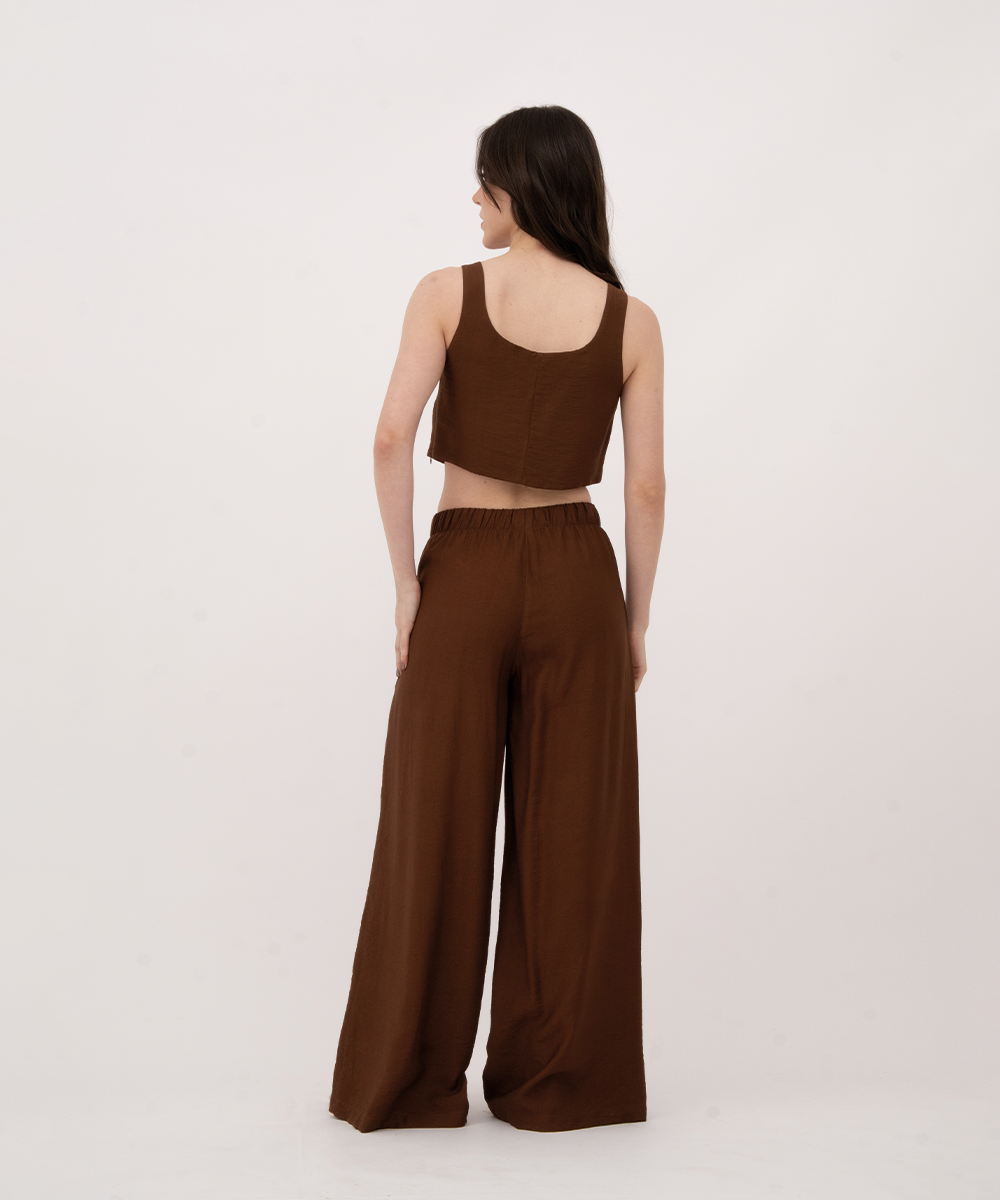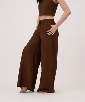 Pantalón silueta amplia, pretina resortada con bolsillos laterales.