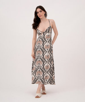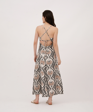 Vestido midi de copas, tiras largas para cruzar y anudar en espalda, cierre invisible en centro posterior.