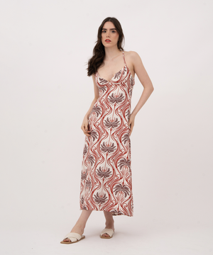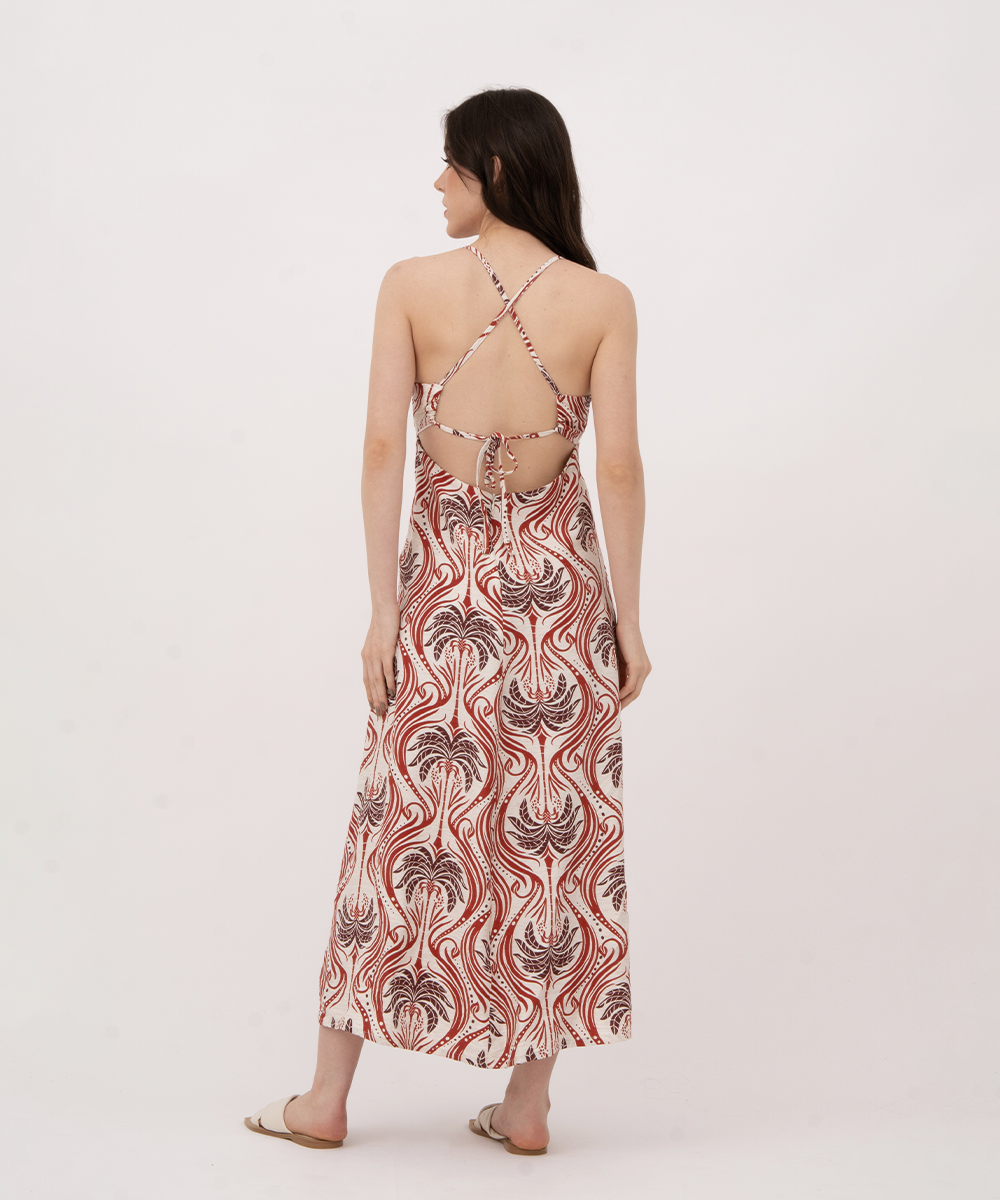 Vestido midi de copas, tiras largas para cruzar y anudar en espalda, cierre invisible en centro posterior.