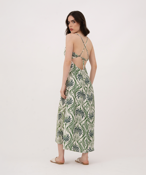 Vestido midi de copas, tiras largas para cruzar y anudar en espalda, cierre invisible en centro posterior.