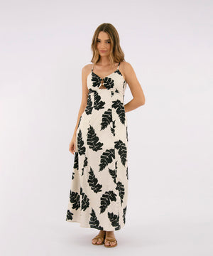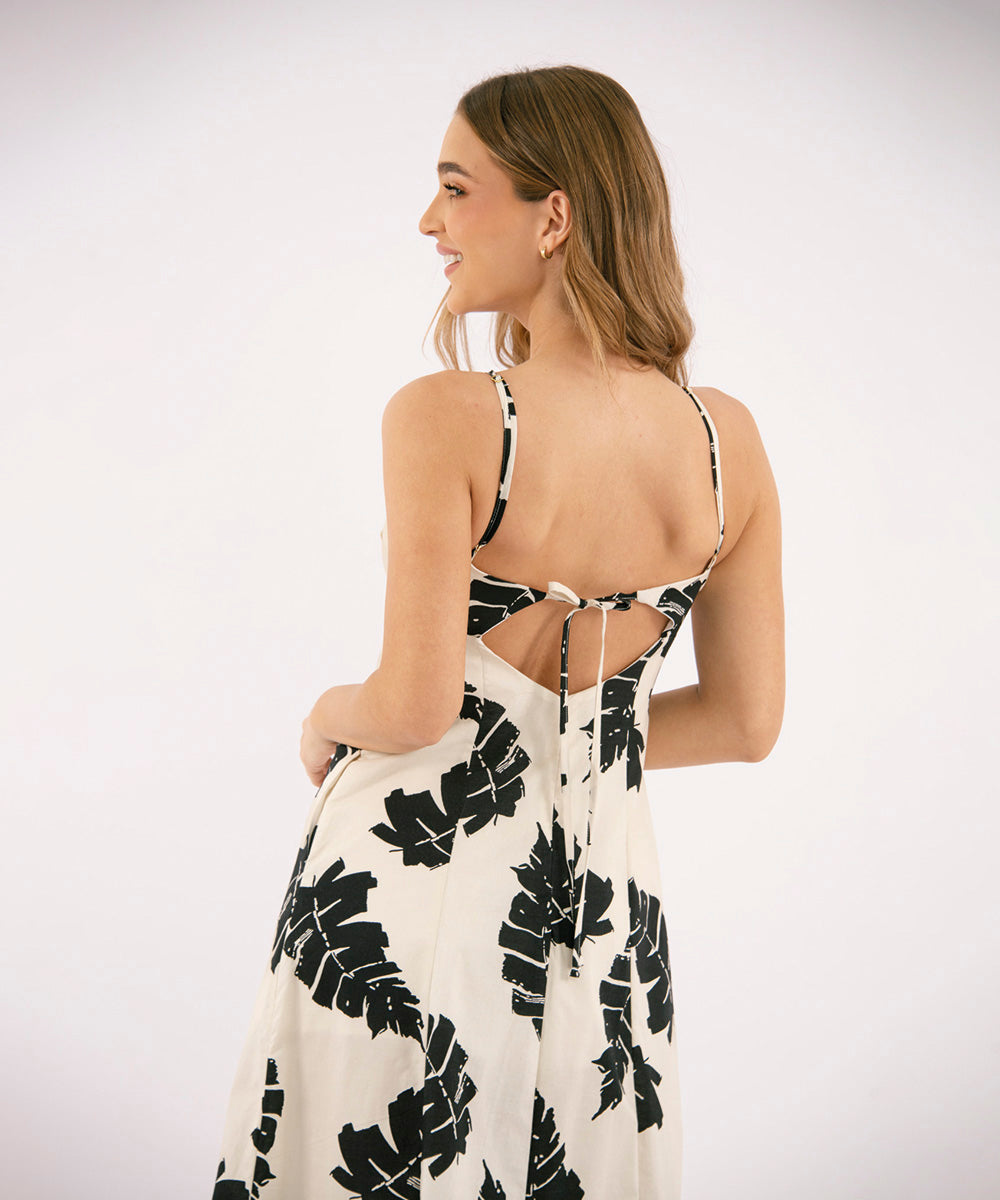 Vestido largo forrado, copas con argolla decorativa, tiras para graduar, escote espalda con lazo para anudar y cortesen nesgas en la parte inferior del vestido. Cierre invisible en centro posterior